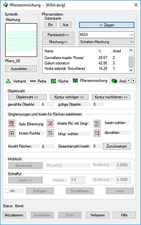 Durch Betätigung der Schaltfläche Schraffieren können Sie die Teilfläche nun mit dem aktuell eingestellten Schraffurmuster und den jeweiligen Werten für den Winkel und die Skalierung schraffieren lassen. Zuvor können Sie beliebige Schraffurinseln auswählen, wobei die Auswahl des Infoblockes nicht notwendig ist. Nach dem Schraffieren wird die Undo-Schaltfläche mit der Bezeichnung Undo Schr. versehen, da Sie damit die Schraffur rückgängig machen können. Sie können nun etwaige weitere Teilflächen in der gleichen Art und Weise ausgestalten und die Pflanzenmischung danach durch Betätigung der Schaltfläche Anwenden abschließen. Nach dem Anwenden können Sie weitere Pflanzungen erstellen oder den Dialog durch Betätigung der Schaltfläche Verlassen beenden.