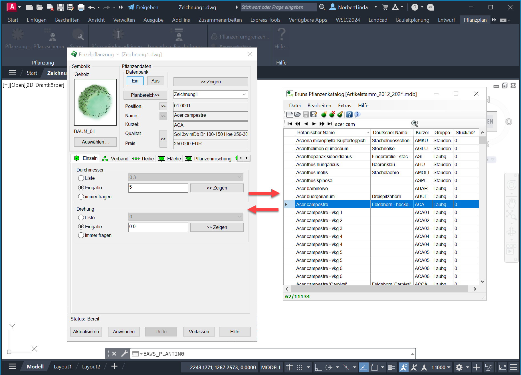 Die Pflanzendatenbank (entweder der BRUNS-Pflanzenkatalog oder Plantus) wird beim ersten Aufruf des Pflanzungs-Befehls stets geladen, um mit den wesentlichen Befehlen der Pflanzplanung arbeiten zu können.