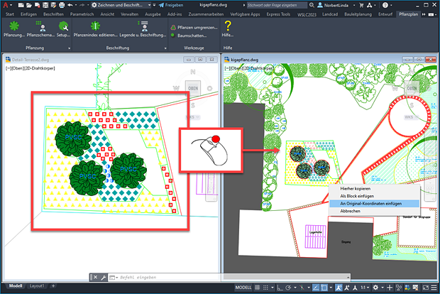 Pflanzungen werden am einfachsten per Drag & Drop von einer in die andere Zeichnung kopiert. Hierbei können sowohl Einzel- als auch Flächenpflanzungen herangezogen werden. Öffnen Sie hierzu einfach beide Zeichnungen und stellen Sie die Fenster am besten nebeneinander, damit beide Zeichnungen sichtbar sind. Stellen Sie danach günstige Zoom-Ausschnitte für die Zeichnungen her, damit Sie den Ursprung und das Ziel bestmöglich sehen und wählen können.