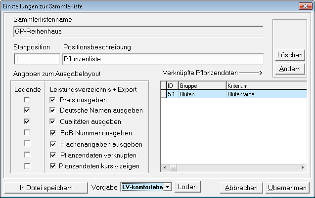In den Einstellungen zur Sammlerliste werden zunächst die Startposition und die Bezeichnung des LVs (Positionsbeschreibung) festgelegt. Anschließend können Sie diverse Angaben zum Ausgabelayout treffen, welche getrennt für das Leistungsverzeichnis und eine Pflanzenliste (Legende) einstellbar sind. Alle Einstellungen können in einer Layoutdatei mit der Dateiendung *.AGO gesichert und jederzeit wieder geladen werden. Für das LV relevante Zusatzinformationen betreffen im Wesentlichen die folgenden Angaben: