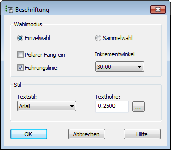 Der Textstil wird bei jedem Programmstart aus den Vorgaben des Setups übernommen. Sie können jedoch wahlweise einen anderen Stil wählen, die einzelnen Werte in den Eingabefeldern des Stils verändern oder diese durch Betätigung der Schaltfläche ... von einem in der Zeichnung gezeigten Textelement übernehmen.