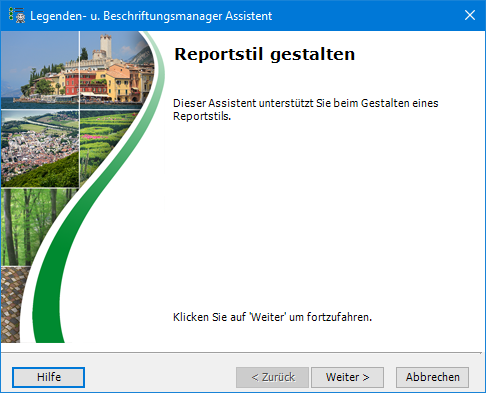 Die Einbindung eines neuen Reportstils wird durch einen Assistenten geleitet, welcher nach Auswahl des Befehls Neuen Reportstil entwerfen... aus dem Kontextmenü oder dem Pull-down-Menü Legende erscheint. |