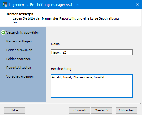 Im zweiten Schritt geben Sie bitte den Namen des Reportstils an sowie eine kurze, prägnante Beschreibung. Die Beschreibung kann auch nachträglich jederzeit im Eigenschaftenfenster des Managers erstellt oder editiert werden. |
