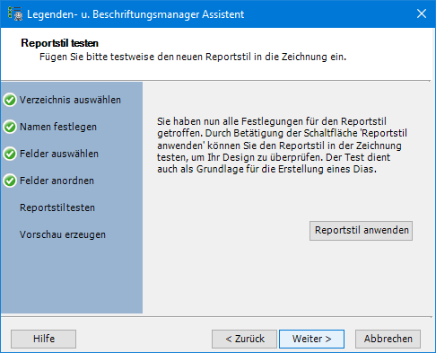Im fünften Schritt haben Sie die Möglichkeit den soeben erstellten Reportstil zu testen. Sollte der Stil noch nicht Ihren Vorstellungen entsprechen, können Sie über < Zurück entsprechende Änderungen vornehmen. |