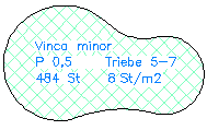Flächenpflanzung – Eine Flächenpflanzung besteht aus mindestens einer geschlossenen Polylinie, deren Fläche mittels einer Pflanzschraffur visualisiert wird. Die Fläche kann zusätzlich mit einem Infoblock gekennzeichnet sein, welcher Angaben wie z. B. den Pflanzennamen, die Qualität oder die Stückzahl enthält. |