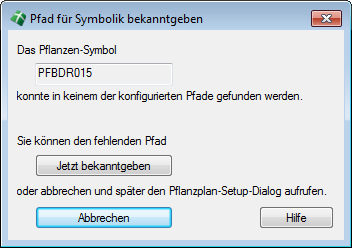 Die Pflanzplanung erkennt selbständig ob ein Grafikelement innerhalb der Zeichnung keine Pfadzuweisung besitzt und öffnet in diesem Fall eine Dialogbox, die es ermöglicht, einen diesbezüglichen Pfad anzugeben. Der Dialog unterscheidet hierbei zwischen Pflanzen-Symbolen, Schraffuren und Inföblöcken und blendet den entsprechenden Dateinamen ein. Da die Pflanzblöcke in Version 2018 i. d. R. andere Namen besitzen, erscheint diese Meldung für jede vorhandene Pflanze, die erneut verwendet und deren Block aber nicht gefunden wird. |