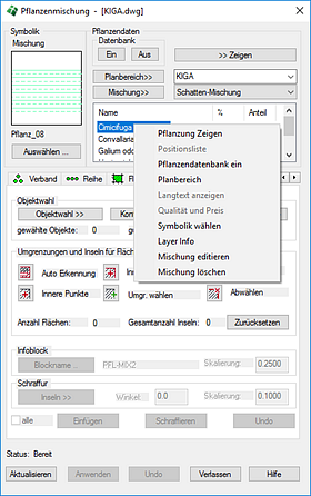 Pflanzenmischungen werden, einmal eingerichtet, fest in der Zeichnung gespeichert und sind dadurch immer wieder aus der Liste abrufbar. Um angewendete Pflanzenmischungen zu löschen, langt es, die dazugehörigen Zeichnungselemente zu löschen (die Kontur ist hierbei obligatorisch). Um einen Listeneintrag zu löschen, verwenden Sie bitte den Befehl Mischung löschen aus dem zur Pflanzenmischung dazugehörigen Kontextmenü. Im Regelfall wurde eine in der Liste befindliche Pflanzenmischung auch in der Zeichnung angewendet. Daher werden mit dem Löschen der Pflanzenmischung auch alle Elemente in der Zeichnung und die betreffenden Pflanzen im LV gelöscht. Auf diese Art und Weise lässt sich, ähnlich wie bei Einzel- oder Flächenpflanzungen in der Positionsliste, ein Löschvorgang automatisieren. Vor dem Löschen eines Listeneintrages erscheint jeweils eine Sicherheitsabfrage. |
