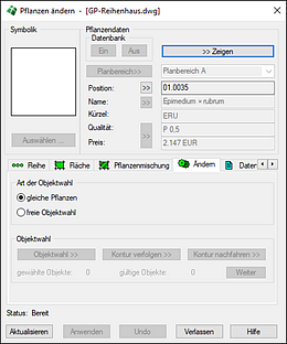 Das Pflanzen ändern ermöglicht die gezielte Änderung beliebiger, mit der Pflanzplanung erzeugter Einzel- und Flächenpflanzungen. Die Änderungsmöglichkeiten betreffen sowohl alle Grafik- als auch Pflanzdaten, womit ein Höchstmaß an Flexibilität in der Planung und der graphischen Ausgestaltung geboten wird. Die Änderungsfunktionen sind darüber hinaus auch in der Lage, Pflanzensymbole nachträglich mit Pflanzdaten zu versehen, um reine Entwürfe zu konkretisieren und weiterzubearbeiten.