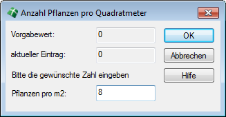Durch die Pflanzendichte wird die Stückzahl einer Teilfläche festgelegt, welche weiterhin von der Flächengröße und dem Füllungsgrad abhängig ist. Die Pflanzendichte wird stets in Stück/m2 angegeben und kann jederzeit verändert werden. Ist nach der Auswahl einer Pflanze kein Vorgabewert in der Datenbank enthalten, öffnet sich eine kleine Dialogbox, in welcher Sie die Pflanzendichte eintragen müssen. Dieser Dialog ist auch in der Ausgestaltungsphase durch Betätigung der Schaltfläche Pflanzendichte verfügbar und zeigt den aktuellen Eintrag sowie etwaige Vorgabewerte der Datenbank an. |