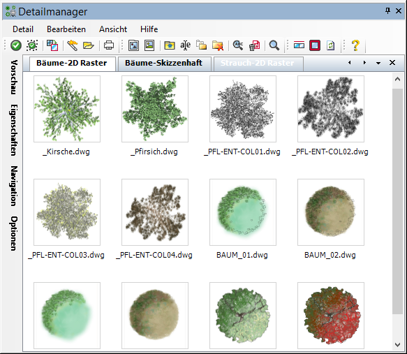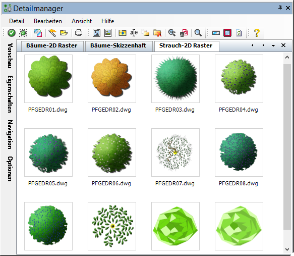 In den Favoriten sind jeweils mehrere Varianten einer Grundform enthalten, um eine abwechslungsreiche Plangrafik zu erreichen. Sollten Ihnen die in den Favoriten gesammelten Symbole für Bäume, Sträucher und Stauden nicht ausreichen, können Sie jederzeit über das Navigationsfenster andere Symbole aus beliebigen Verzeichnissen auswählen.