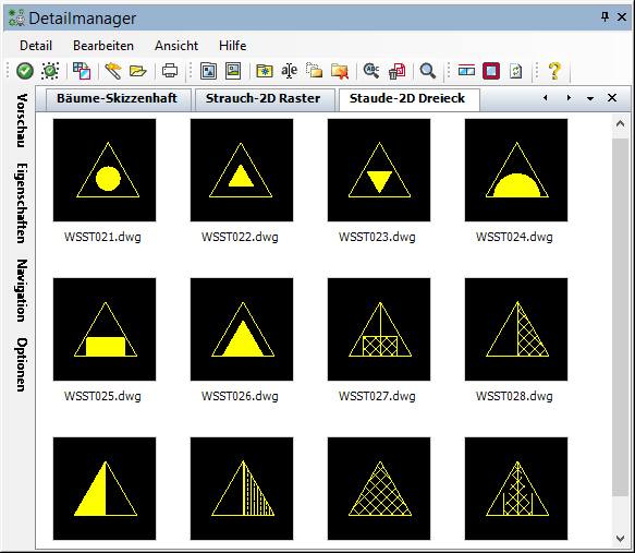 Wird innerhalb des Befehls Pflanzung auf Pflanzensymbole zugegriffen, stehen diese als Favoriten in der modularen Form des Detailmanagers zur Verfügung. Die Favoriten unterscheiden sich wie folgt: