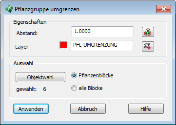 Mit Hilfe dieses Befehls lassen sich ausgewählte Pflanzensymbole in einem definierten Abstand mit einer oder mehreren Polylinien umgeben. Der Befehl dient vor allem zur Erstellung von Schraffurinseln, welche sonst mühsam von Hand gezeichnet werden müssten.