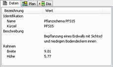 Die Schemadaten sind im Definitionsdialog jederzeit abrufbar, indem im Grafikfenster auf den Reiter Daten gewechselt wird. Hier sind auch zusätzlich die Maße des Schemas aufgeführt. |