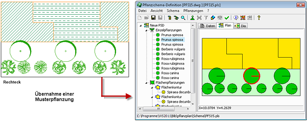 Anmerkung: Flächenpflanzungen, die über das umgrenzende Rechteck hinausragen, werden mit diesem verschnitten, so dass der jeweilige Anteil innerhalb des Rechteckes für das Schema verwendet wird.