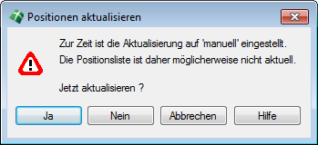 Die Positionsliste kann zum Betrachten geöffnet werden, falls Sie den Vorschlag zur Aktualisierung ablehnen. Aus Gründen der Datensicherheit werden jedoch alle Bearbeitungsfunktionen ausgegraut dargestellt, sind also solange nicht verfügbar, bis Sie eine Aktualisierung vorgenommen haben.