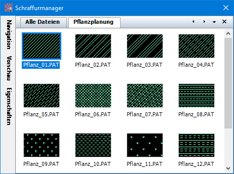 Schraffuren werden zur grafischen Ausgestaltung von Flächenpflanzungen verwendet. WS LANDCAD bietet diverse, für die Pflanzplanung geeignete Schraffuren im Verzeichnis \LIB\ENTWURF\SCHRAFFUREN\PFLANZPLANUNG\, welches automatisch als Favorit installiert wird. Hierbei handelt es sich um einzelne AutoCAD-Schraffuren. Sie können jedoch beliebige Schraffurmuster verwenden, die als einzelne Datei *.PAT vorliegen oder mit dem Schraffurmanager der Entwurfsplanung zusätzliche Muster generieren. Den Schraffuren für die Flächenpflanzung ist bereits der Vorgabelayer PFL-SCHRAFFUR zugeordnet. |