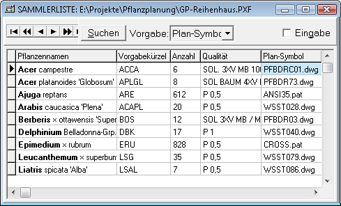 Beim Erstellen einer Sammlerliste für Plantus wird die Symbolik zu jeder Position innerhalb der Sammlerliste mitgespeichert. Wenn Sie später auf eine Sammlerliste zugreifen, die mit der Pflanzplanung erstellt wurde, werden Sie erkennen, dass sowohl Pflanzsymbole als auch Schraffurmuster automatisch im Pflanzungsdialog erscheinen, wenn Sie eine Pflanze von einer Sammlerliste in den Pflanzungsdialog ziehen. Auf diese Art und Weise können Sie die Grafik für theoretisch jede Pflanze vorbestimmen.