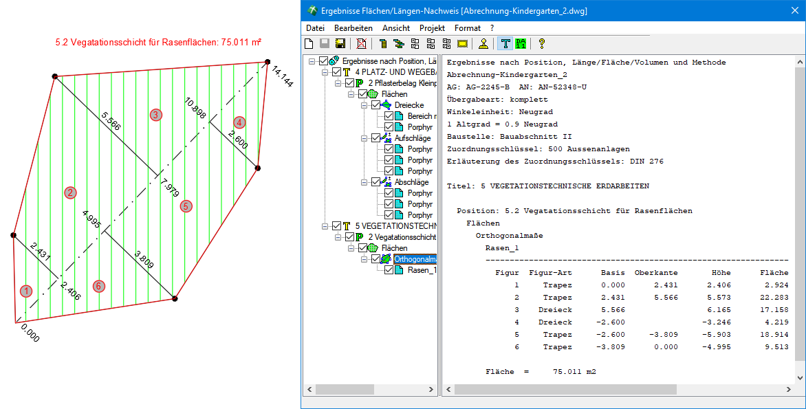 • Der Flächennachweis enthält die Flächennummern, die Angabe der geometrischen Grundform (Figur), die in Frage kommenden Werte für Basis, Oberkante und Höhe sowie die jeweilige Fläche.