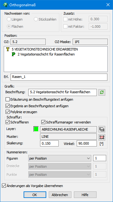 Dies bedeutet, dass Sie nun entweder die Objektwahl erneuern, die Einstellungen für diese Position vornehmen (Layer, Texthöhe, Polylinie erzeugen) oder direkt zur Berechnung übergehen können. Stellen Sie also spätestens jetzt den Layer und die Texthöhe im mittleren Dialogteil ein und überprüfen Sie die Angaben zur Position.