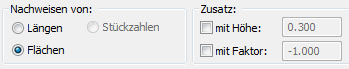 Der Berechnungstyp wird am oberen Dialog ausgewählt. Primär sind Längen, Flächen und Stückzahlen nachweisbar. Sie können jedoch einen konstanten Höhenwert vergeben, welcher dann mit dem Ergebnis multipliziert wird. Auf diese Art und Weise sind auch Volumina, etwa Tragschichten, Oberboden u. ä. berechenbar. Für die Längen- und Flächenberechnung gelten jeweils eigene Einstellungen in Bezug auf die verwendeten Layer. Die Eingabe eines Faktors ist ebenfalls möglich. So können z. B. Verdichtungs- oder Lockerungswerte berücksichtigt werden oder auch einfach Abzüge, indem der Wert –1 verwendet wird. Stückzahlen können nur dann berechnet werden, wenn die Berechnungsmethode Sonstige gewählt wurde.