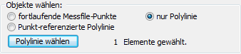 Bei diesem Objektwahlmodus spielen aufgenommene Messpunkte keine Rolle. Es handelt sich um einen Vollautomatismus, welcher in der Lage ist, Polylinien, auch solche mit beliebigen Kreisbögen, direkt zu verwerten. Hierbei erfolgt eine automatische Punktvergabe gemäß dem eingestellten Modus sowie die automatische Generierung passender Auf-/Abschläge, falls die Polylinie Bögen enthält. Messfile-Punkte brauchen bei dieser Methode nicht vorhanden sein, da auch die Punktnummerierung selbstständig erstellt wird.
