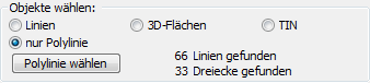 Dieser Modus erlaubt die vollautomatische Generierung eines TINs aus einer Polylinie und bei Bedarf zusätzlich aus mehreren Insel-Polygonen, wobei eventuell vorhandene Kreisbögen als Auf-/Abschläge berechnet werden.