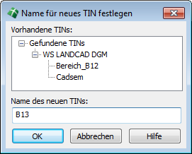 Zunächst erscheint eine Dialogbox zur Festlegung eines neuen TIN-Namens, wobei alle bereits in der Zeichnung vorhandenen TINs und ihre Herkunft in einer Baumstruktur aufgelistet werden. Nachdem Sie einen passenden Namen vergeben haben, werden Sie zur Auswahl einer Polylinie aufgefordert, welche den zu berechnenden Bereich umfasst. Falls zusätzlich innere Umgrenzungen vorhanden sind, wählen Sie hier bitte die äußere Umgrenzung aus.
