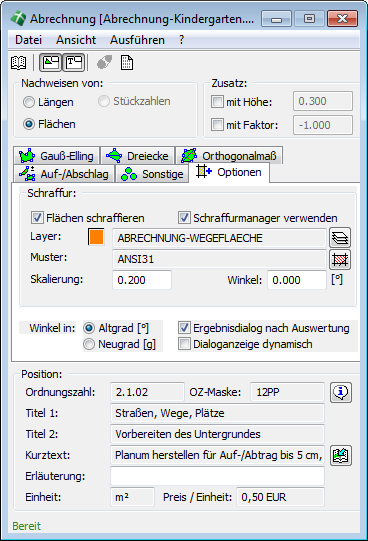 Die Angaben zur Schraffur sind hier lediglich Vorbelegungen. Bei jedem Berechnungsverfahren, welches die Darstellung einer Schraffur zulässt, können Schalter und Werte im jeweiligen Anwendungsdialog separat festgelegt werden. |