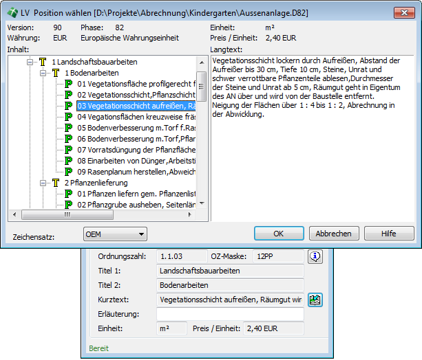 Sobald ein gültiges Leistungsverzeichnis zugewiesen wurde, kann eine aktuelle Position gewählt werden. Nach der Betätigung des entsprechenden Icons im unteren Bereich des Hauptdialoges wird das LV in einer zweigeteilten Dialogbox angezeigt. Im linken Bereich sind die Titel und Positionen aufgeführt, während im rechten Bereich der Langtext einer gewählten Position angezeigt wird. Im oberen Bereich sind weitere Informationen zum LV (Version, Phase) und der Position (Einheit, Preis) aufgeführt. Sie können nun eine beliebige Position im linken Bereich auswählen und mit OK bestätigen. Das zusätzliche Eingabefeld Erläuterung dient zur freien Eingabe eines beliebigen Erläuterungstextes, welcher auch bei der Positionsbeschriftung als Vorgabe verwendet wird.