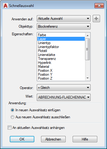 Die zur Objektwahl optional verwendbare Schnellauswahl definiert Filterkriterien und legt fest, auf welche Weise der Auswahlsatz anhand dieser Kriterien erstellt werden soll. Damit lässt sich ein Auswahlsatz komfortabel eingrenzen bzw. fest bestimmen. Wenn Sie beispielsweise alle in Ihrer Zeichnung vorhandenen (als Block definierten) Baumscheiben in die Auswahl übernehmen wollen, müssen Sie diese nicht mühselig manuell selektieren, sondern können diese auf einen Schlag wählen, indem Sie die entsprechenden Filterkriterien anwenden. Die Schnellauswahl beinhaltet folgende Optionen: