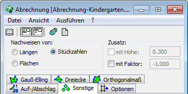 Aus diesem Grund gibt es den separaten Reiter Sonstige, welcher im Dialogbereich Nachweisen von: die Option Stückzahlen freigibt, welche bei den übrigen Verfahren natürlich nicht zugänglich ist. Die Optionen Längen und Flächen sind weiter zugänglich, da damit rechnerisch nicht nachweisbare Objekte, z. B. Splines übernommen werden können.