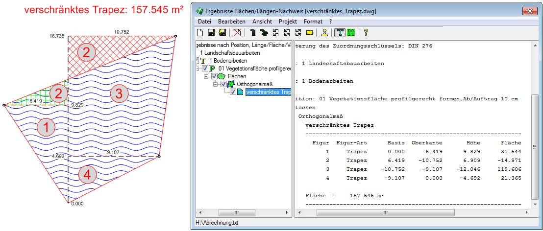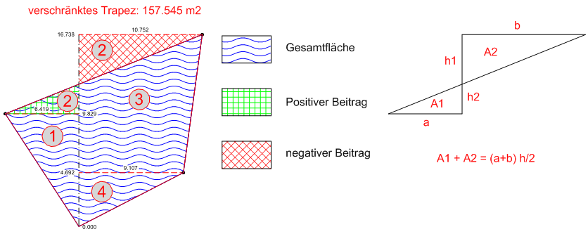 - Normales Trapez – mit Basisseite a (Ordinatenwert des aktuellen Messpunktes auf die Abszisse), Parallele Seite b (Ordinatenwert des nächsten Messpunktes auf die Abszisse) und Höhe h (Zuwachs des Abszissenwertes vom aktuellen zum nächsten Messpunkt). Damit so ein normales Trapez entsteht, müssen die beiden Ordinatenwerte das gleiche Vorzeichen haben.