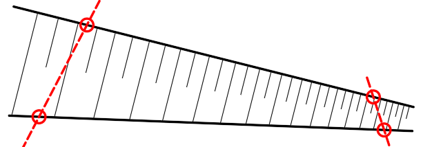 Eine Böschungsschraffur muss nicht zwangsweise über die gesamte Länge der Böschungskanten verlaufen. Durch die Verwendung von Anfangslinien kann daher die erste und letzte Schraffe zwischen den Böschungskanten definiert werden. Die Lage von Anfangslinien wird durch die Bestimmung zweier Punkte definiert, welche die Ober- und Unterkante berühren oder schneiden müssen.
