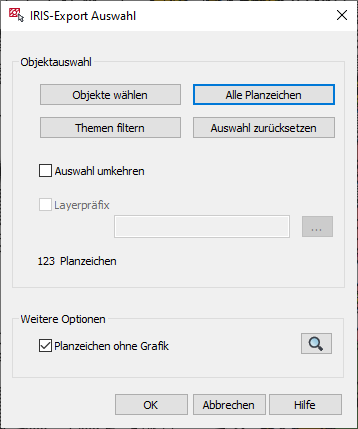 Der Befehl öffnet zunächst den Dialog IRIS-Export-Auswahl, worüber die Planzeichen in der Zeichnung grafisch gewählt werden können.