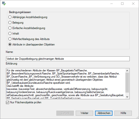 Attribute in überlappenden Objekten: Mit dieser Klasse werden Bedingungen angelegt, die eine Belegung eines bestimmten Attributes in Objekten, die ein anderes Objekt mit dem gleichen Attribut besitzt, verbieten. Als Beispiel hier die Belegung der Attribute Bauweise, Bebauungsart etc., die bei sich überlagernden Objekten nicht redundant ausgefüllt werden dürfen. |