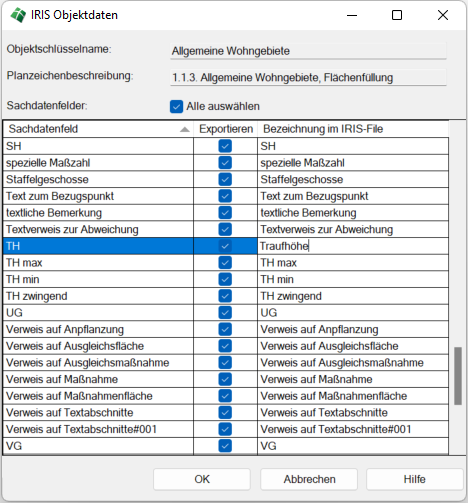 Das exportierte Sachdatenfeld könnte parallel auch von anderen Themen exportiert werden. Eine Umbenennung in der Spalte Bezeichnung im IRIS-File führt automatisch dazu, dass die Bezeichnung auf andere Themen angewandt wird. Ein Beispiel: Das Datenfeld TH soll im IRIS-System mit dem Klarnamen Traufhöhe auftauchen. Wenn neben den Allgemeinen Wohngebieten parallel auch Mischgebiete u. Ä. mit Festsetzungen zu demselben Maß exportiert werden, wird die Umbenennung bei den anderen Inhalten des Planes ebenfalls wirksam.