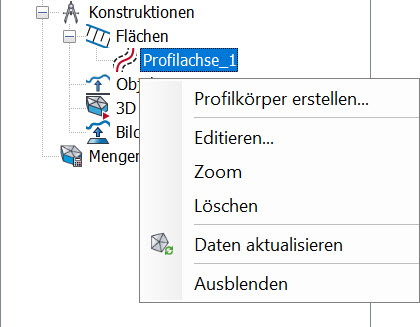 Gleichzeitig erscheint die Bezeichnung der Profilachse als Eintrag unterhalb von Flächen im Projektbrowser. Der Eintrag verfügt über ein Kontextmenü mit weiteren Befehlen. So lässt sich nun ein Profilkörper an dieser Profilachse erstellen. Des Weiteren kann die Profilachse auch jederzeit editiert, gelöscht oder auf sie gezoomt werden. |