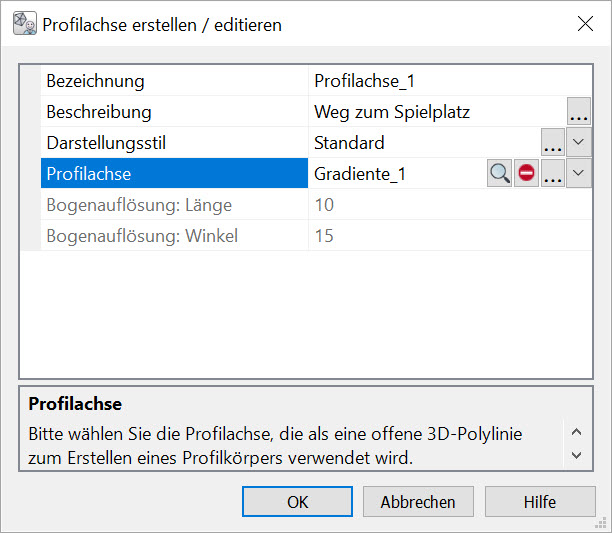 Der Aufruf des Befehls öffnet den Dialog Profilachse erstellen / editieren, welcher im Wesentlichen zur Auswahl eines geeigneten Objekts und dessen Bezeichnung dient. Darüber hinaus können die Bogenparameter festgelegt und eine optionale Beschreibung eingegeben werden. |