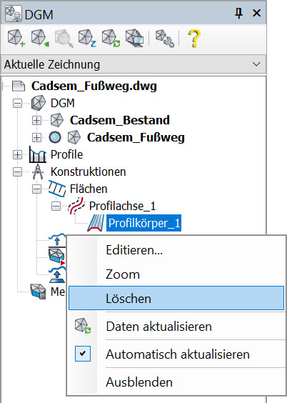 Das Löschen eines bestehenden Profilkörpers erfolgt über die Auswahl des Elementes im Projektbrowser und den Aufruf des Befehls Löschen aus dem zugeordneten Kontextmenü. Hinweis: Das Löschen eines Profilkörpers führt zusätzlich zum Entfernen aller referenzierten Elemente! Dies betrifft sowohl die erzeugten Polylinien als auch alle Bestandteile einer Böschungsschraffur. |