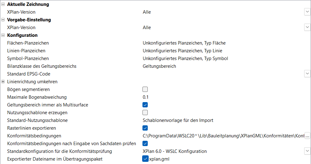 - Vorgabe-Einstellung - XPlan-Version - Für eine Zeichnung ohne Planzeichen greift das Programm beim Anwenden des ersten Planzeichens auf die unter XPlan-Version gewählte Version zurück und setzt die entsprechenden Parameter für die Option Aktuelle Zeichnung - XPlan-Version. Alle zeigt ungefiltert alle dem Programm bekannten Sachdatenfelder an. XPlan 6.0 - WSLC Konfiguration heißt wiederum, dass nur Sachdatenfelder im Sachdatendialog sichtbar sind, die auch zur Version 6.0 exportiert werden können!