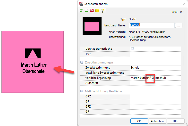 Der Nachteil dieser Methode war bisher, dass diese Zeichenkombination in die XPlanGML exportiert wurde. Mit WS LANDCAD 2024 werden nun die exportierten Sachdateninhalte ohne die Zeichenkombination \P herausgeschrieben. Sie taucht somit nicht mehr in der XPlanGML auf. Im Umkehrschluss heißt das aber nicht, das sie durch einen XPlanImport gebildet werden können.