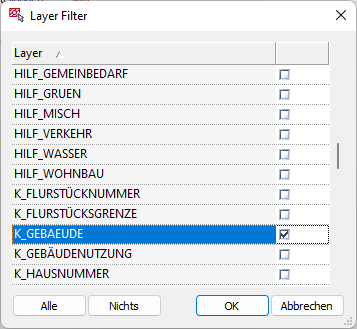 Alle aktiviert alle Layer der Zeichnung. Mit Nichts wird die Auswahl zurückgesetzt und man hat die Möglichkeit, über die einzelnen Checkboxen dezidiert die gewünschten Layer zu bestimmen. Mit OK werden die Einstellungen des Layerfilters übernommen und mit Abbrechen eine veränderte Layerwahl nicht übernommen. |