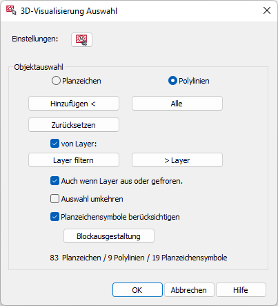Im Auswahl-Dialog wird die Anzahl der gefundenen Planzeichen, Polylinien und Planzeichensymbole angezeigt. Auch bei der Objektauswahl nach Polylinien müssen Planzeichen erkannt werden, weil diese die Höheninformationen an die zu extrudierenden Polylinien vererben.