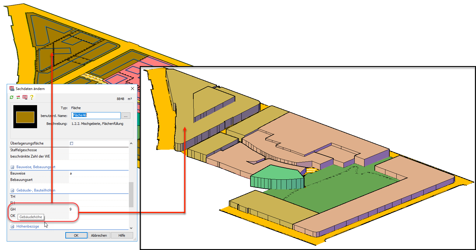 Die Volumenkörper repräsentieren weiterhin die Original-Planzeichen. Dies bedeutet, dass man über den Sachdaten-Dialog die Höhenattribute ändern kann und ein erneuter Aufruf des Befehls 3D-Visualisierung die Extrusionshöhe aktualisiert. Die Volumenkörper lassen sich zu jedem beliebigen Zeitpunkt auch wieder automatisch entfernen. Dazu nutzen Sie den Befehl Neuzeichnen in der Gruppe Anzeige. In die Draufsicht gelangt man über den Befehl DRSICHT.