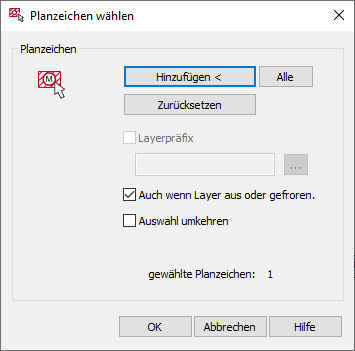 Mit Hilfe des Befehls Aktualisieren... hat man die Möglichkeit, über den Wählen-Dialog die Planzeichen auszuwählen, deren Sachdaten abgeglichen werden sollen. Die kompletten Planzeichen einer Planzeichnung können über die Auswahl des Alle Buttons gewählt werden. |