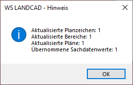 Nach einer Bestätigung mit OK gibt WS LANDCAD eine Rückmeldung über die Anzahl der aktualisierten Objekte. |