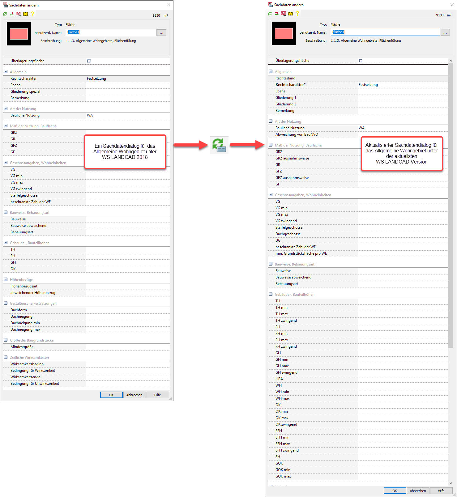 Im untenstehenden Vergleich sieht man, dass der Sachdaten-Dialog des Allgemeinen Wohngebiets der WS LANDCAD Version 2018 deutlich weniger Daten anbot als die aktuellste Version. Daraus ergibt sich die Möglichkeit, deutlich mehr Informationen in den Sachdaten zu hinterlegen.