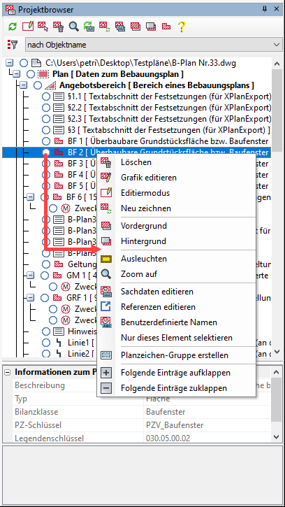 Der Projektbrowser ist das Verwaltungswerkzeug der Planzeichenverordnung. Es listet alle Planzeichen einer Zeichnung auf und verwaltet diese über angelegte Pläne und Bereiche.