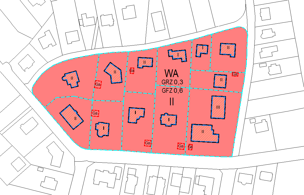 WS LANDCAD vermag diese Berechnungen überschlägig für ein geplantes Baugebiet durchzuführen oder detailliert für ein einzelnes Grundstück. Die Betrachtung einzelner Grundstücke erlaubt es daher auch, Berechnungen im Bestand durchzuführen und damit das tatsächliche Maß der baulichen Nutzung nachzuweisen. Wie detailliert das Programm hierbei vorgeht, legen im Wesentlichen Sie durch die entsprechend zu zeichnenden Planzeichen und die Angabe von Geschossen fest.