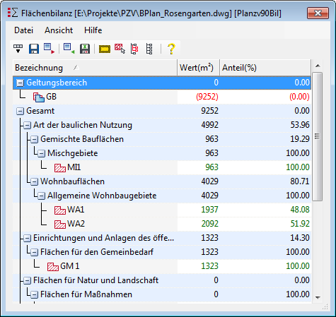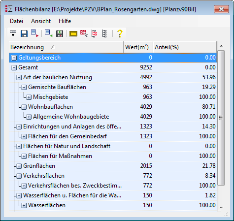 Die Gliederung der Anzeige lässt sich bequem mit Hilfe der Plus– und Minusschalter steuern. So lassen sich einzelne Gliederungspunkte gezielt ein- oder ausblenden. Gleichzeitig besteht die Möglichkeit, die Planzeichen (Objekte) durch Betätigung der entsprechenden Icons in der Toolbar automatisch ein- oder auszublenden.